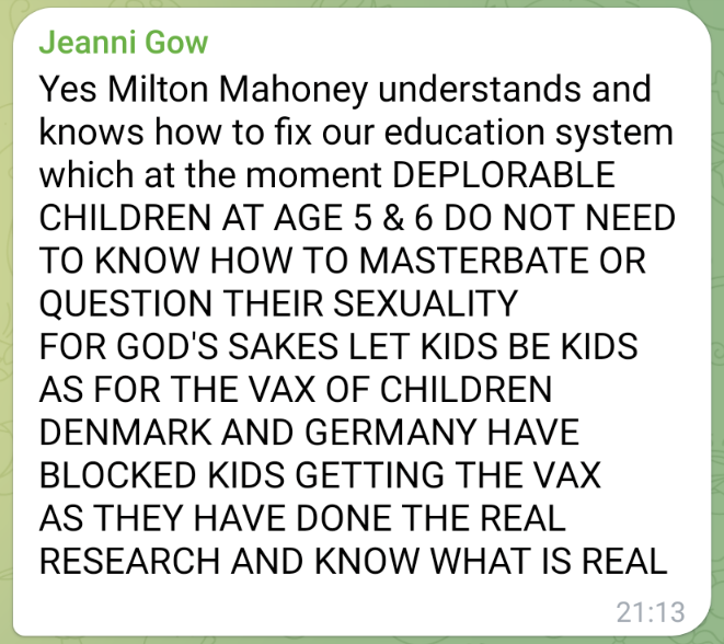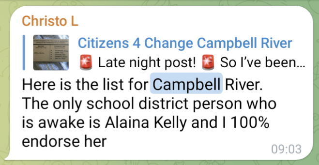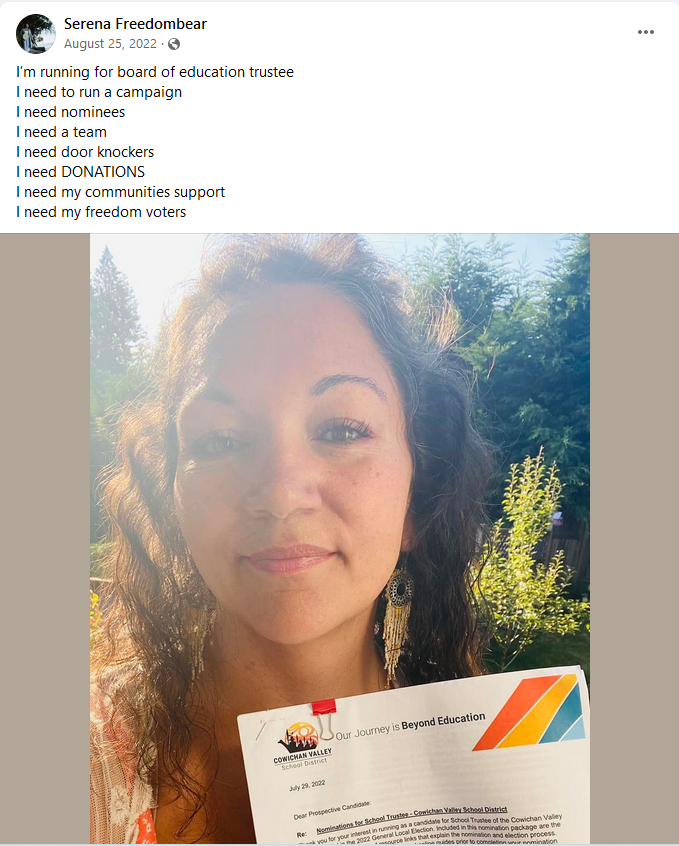 At an election event held on Gabriola Island, School District 68 trustee candidate Tanner Scott brought graphic photos of gender-affirming surgeries prior to recovery. He wasn’t removed because he repeated transphobia—his entire platform was based on transphobic alt- and far-right memes around suicide rates. He was removed because he shoved photos into parents’ faces and caused a disturbance. Scott’s transphobic videos were widely shared among far-right groups and candidates like North Cowichan school trustee candidate and far-right influencer Serena “Freedombear” Winterburn, who jumped to his defense. (Winterburn finished second to last and then went to a rally with anti-Semitic Holocaust denier Chris Sky.) Despite being arrested at removed from a school trustee event by RCMP, Scott was still allowed to finish his campaign and remain on the ballot.