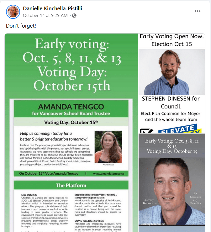 The electoral system prides itself on hearing all sides—Elections BC calls itself agnostic and has stated in the past that it has no interest in examining the politics of candidates—but this approach leaves candidates free to engage in hate speech, discriminate against people at events or in materials, and share dis/misinformation through their election platforms. Some opinions don’t deserve debate and topics like basic human rights are not up for debate.