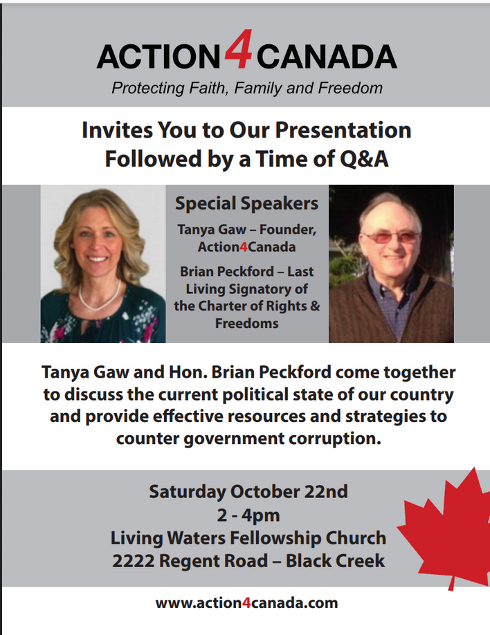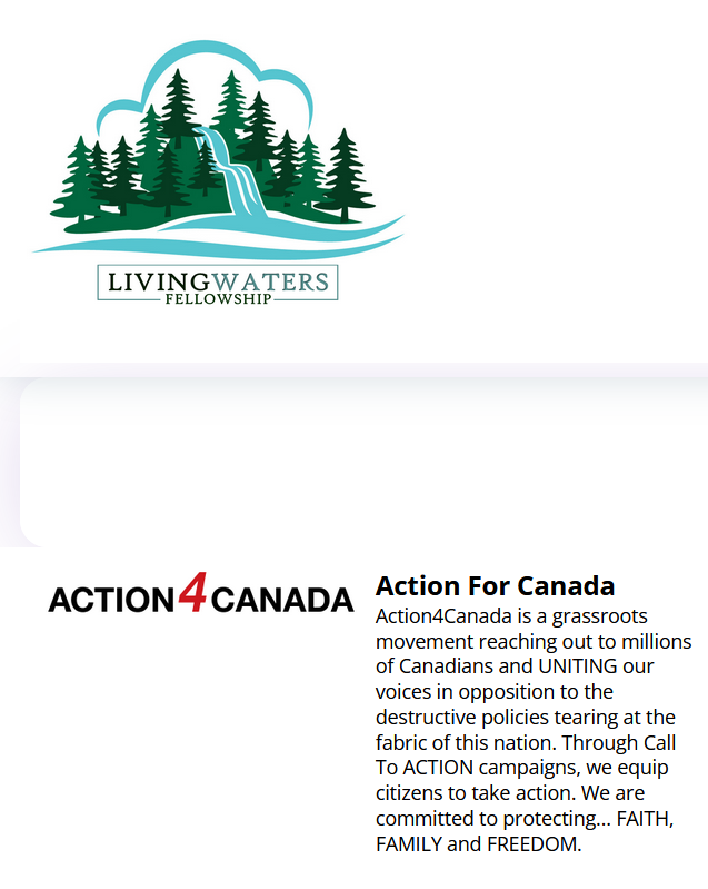 Alaina is associated with Living Waters Fellowship Church in Black Creek, a church that promotes Action4Canada to its members and holds Action4Canada events.