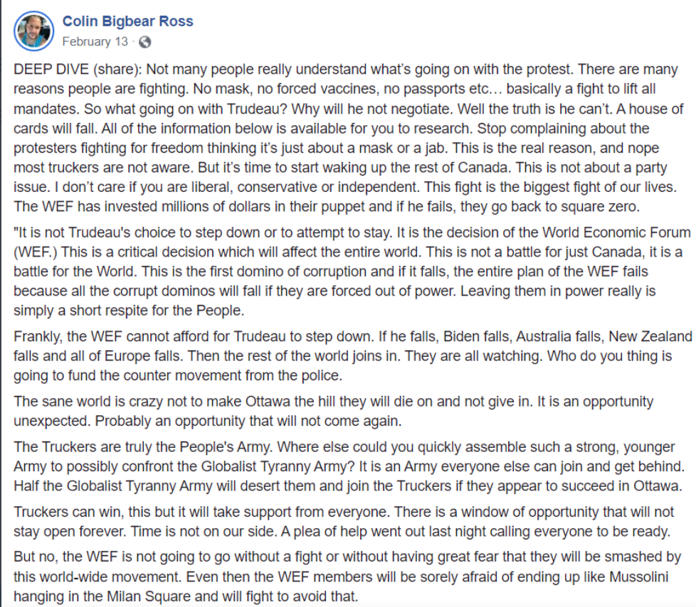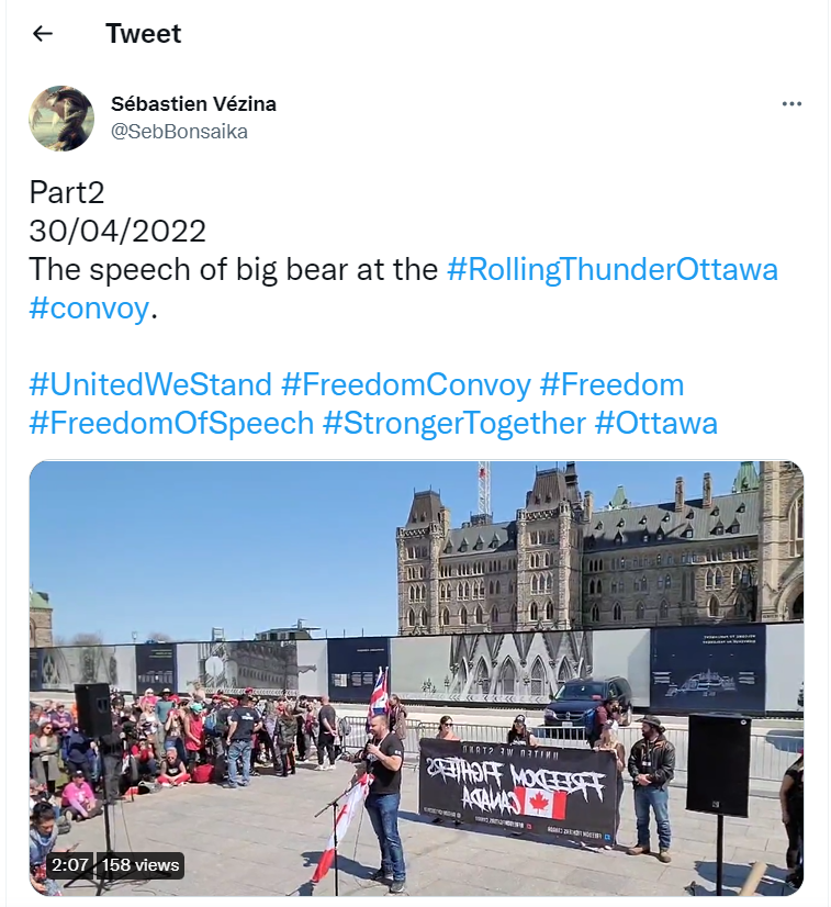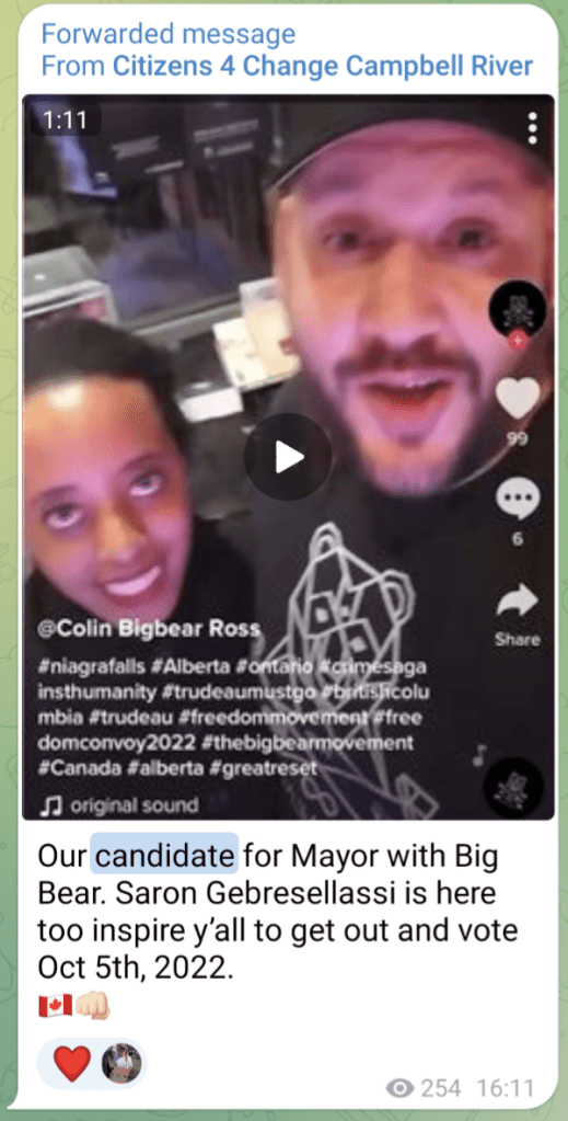 Saron was endorsed by Colin “Big Bear” Ross, who was active in the Ottawa convoy and spends a lot of time complaining about the usual convoy/freedom things on social media and far-right podcasts. Colin also founded the Big Bear Movement and styled himself as a spiritual healer, which some have pointed out as a little cult-ish.