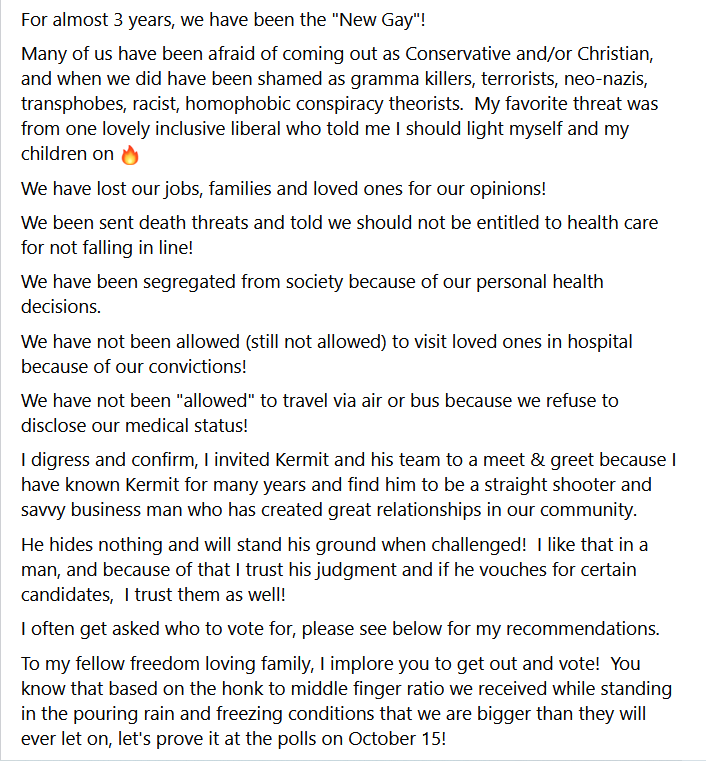 So that’s why this page has changed considerably. Funny that it’s ostensibly okay for groups like local Action4Canada chapters to promote and endorse candidates, but suddenly it’s defamation when we point out what’s going on in public Telegram and Facebook groups. The photo that used to be at the top of this page was never “our” photo or “our” list. It was an image passed around a hate group. Asking why candidates’ names appear in hate groups is simply part of informed votership.