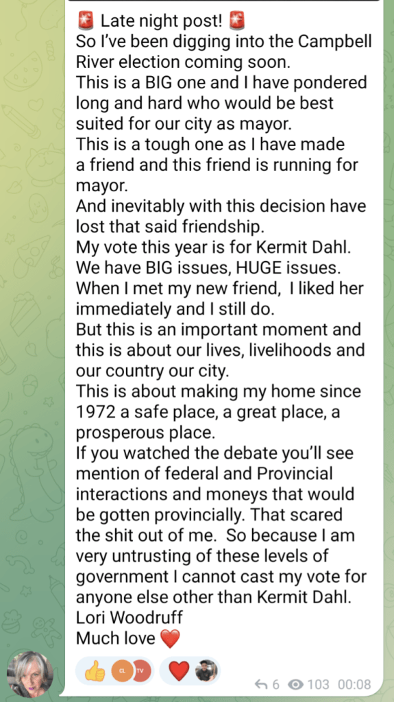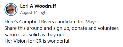 People keep threatening to sue us over this particular page. Perhaps we should have been more explicit in explaining that a group of Campbell River candidates was set to speak at a meet and greet organized by Campbell River Freedom, ostensibly with the goal of seeking votes from Campbell River Freedom membership. (Hot tip: if you want to hide affiliations, the phone number on your event poster shouldn’t match the publicly visible phone number on your Facebook page.) The event was cancelled about a week before it was set to take place.