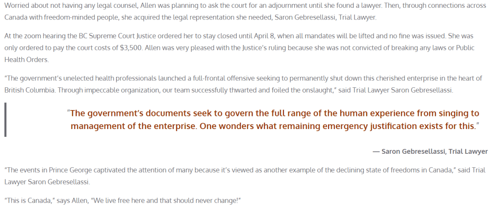 Back in BC, Saron was a lawyer for the convoy/freedom hangout spot Lambda Cabaret nightclub in Prince George, which spent all pandemic refusing to follow public health orders until they were finally temporarily shut down by Northern Health. The following is from the Prince George freedom group, so I won’t link it directly: