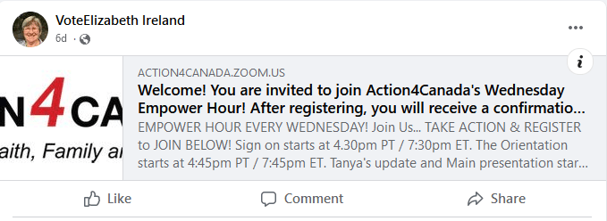 Elizabeth supports christofascist organization Action4Canada.
