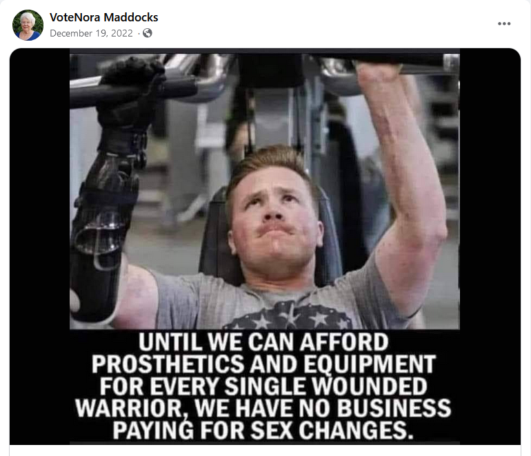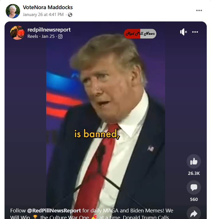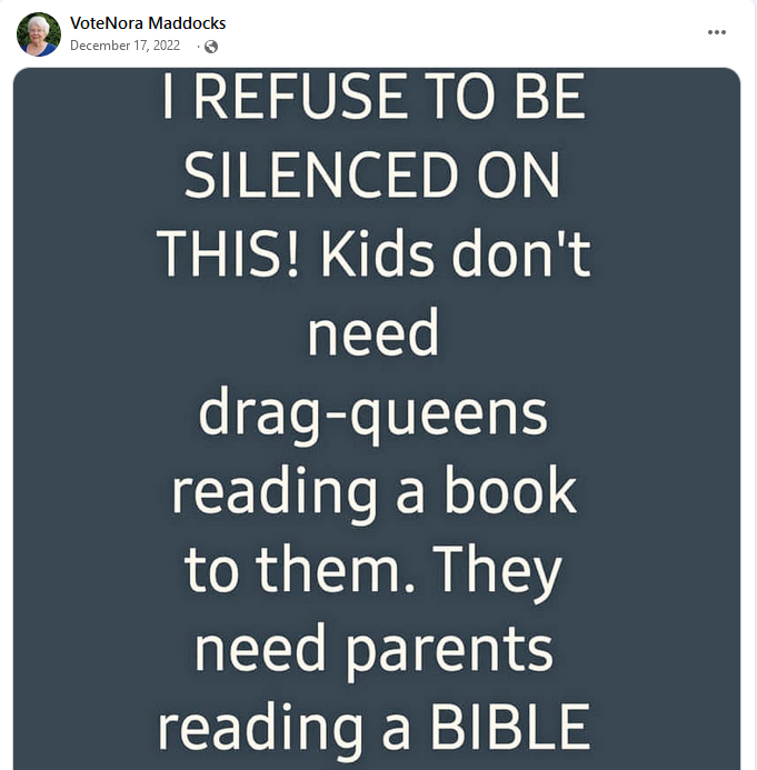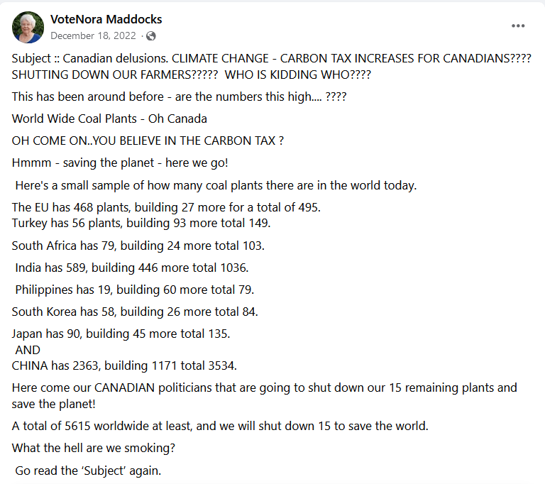 Nora is a fan of Rebel News, Donald Trump, Pierre Poilievre, and the usual far-right nonsense (transphobia, WEF conspiracies, chemtrails, climate change denial, etc.).