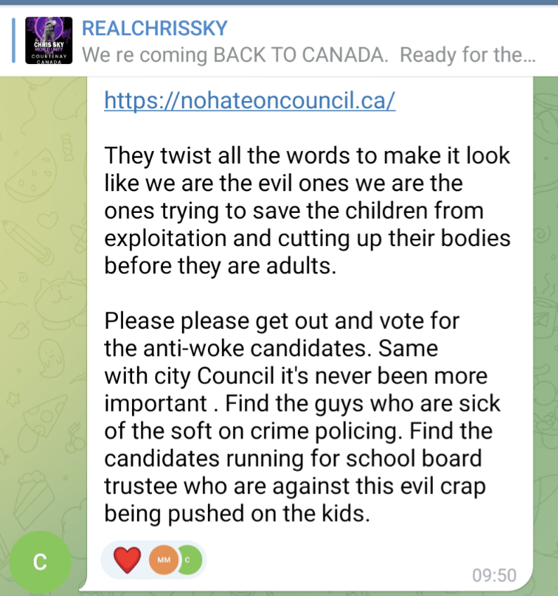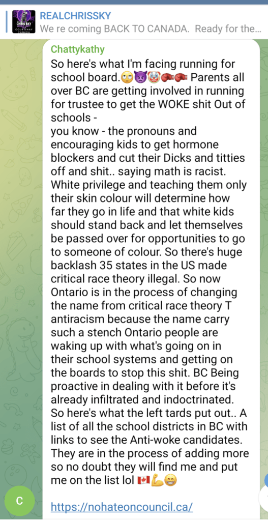 Katie went to Canadian antivaxx embarrassment and Hitler admirer Chris Sky’s Telegram channel to complain about the big meanies of No Hate on Council who make it harder for people associated with far-right politics to be elected.