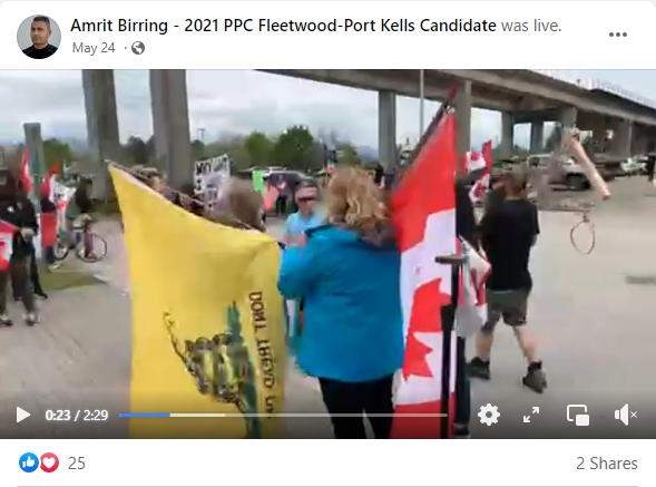 On one side, you can see a Gadsden flag, a flag of racist US origin most associated today with the far-right. On the other side, you can see Amrit’s Stand United buddy Justin Gordon carrying a noose meant for Prime Minister Trudeau.