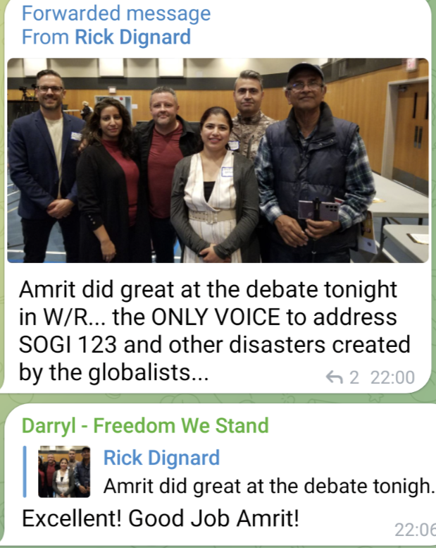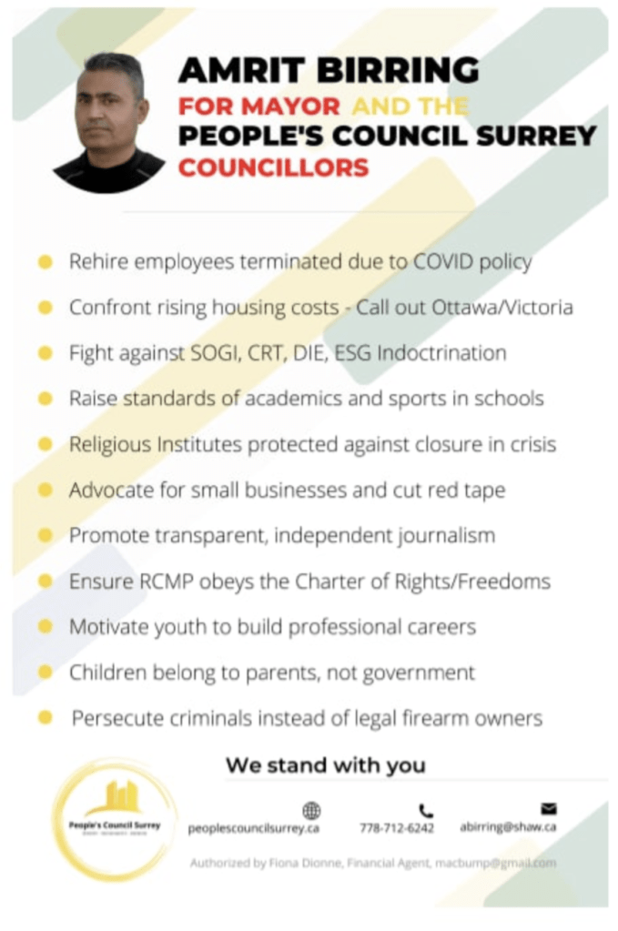 Amrit was the People’s Party of Canada candidate for Fleetwood-Port Kells in 2021 and is a climate change denier, against SOGI 123, against public health mandates. He hangs out with Stand United.