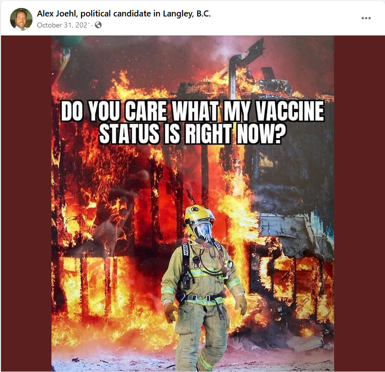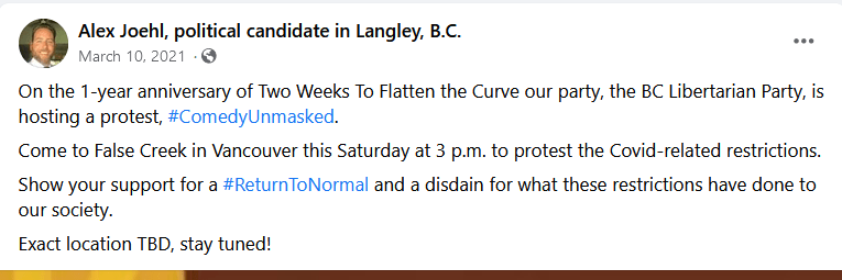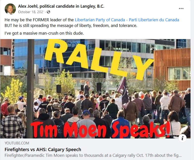 Alex is another libertarian (anarcho-capitalist, really) who benefits from state public health efforts (i.e. clean drinking water, health care, safety regulations in many facets of life) while he argues that asking people to do their part during a pandemic is tyranny. He ran for the BC Libertarian Party twice (2017 and 2020), which is the party that marched around downtown Vancouver with hate groups like No New Normal, Masks Over Hugs, and Action4Canada.
