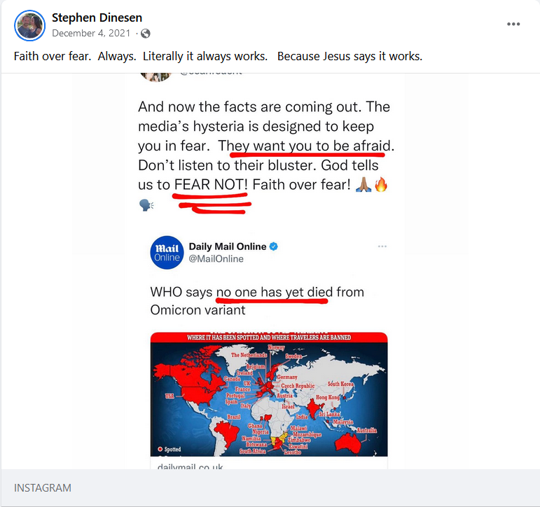 Stephen is a fan of convoys, supports BC’s very own Christofascist leader Laura-Lynn Tyler Thompson, thinks COVID is a lie (that can also be cured by God), and shares COVID vaccine disinformation from the Disinformation Dozen‘s Robert F. Kennedy Jr. Stephen was endorsed by Freedom Rally World organizer Danielle Kinchella-Pistilli alongside a horrifically transphonic Vancouver school trustee candidate and a member of Action4Canada running for Vancouver city council.