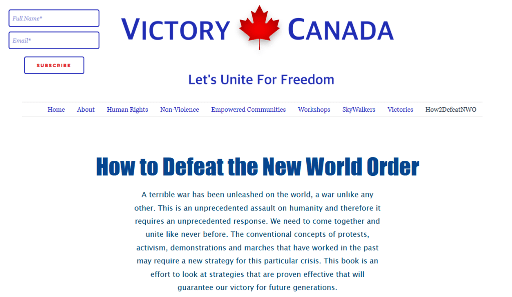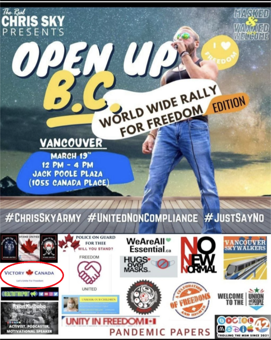 Victory Canada supports anti-Semitic holocaust denier and public health failure Chris Sky. They also promoted individuals like Charles Hoffe and Stephen Malthouse, who participated in Doctors on Tour, which was led by the Canadian Voters Association and Frontline Canada, which was organized by Kari Simpson, who also led Culture Guard, which is yet another violently transphobic and homophobic Christofascist organization that flipped to COVID denialism, vaccines and public health mandates when the pandemic started. Further, Victory Canada is also led by Rick Thomas, who likes to write books with anti-Semitic dogwhistles.