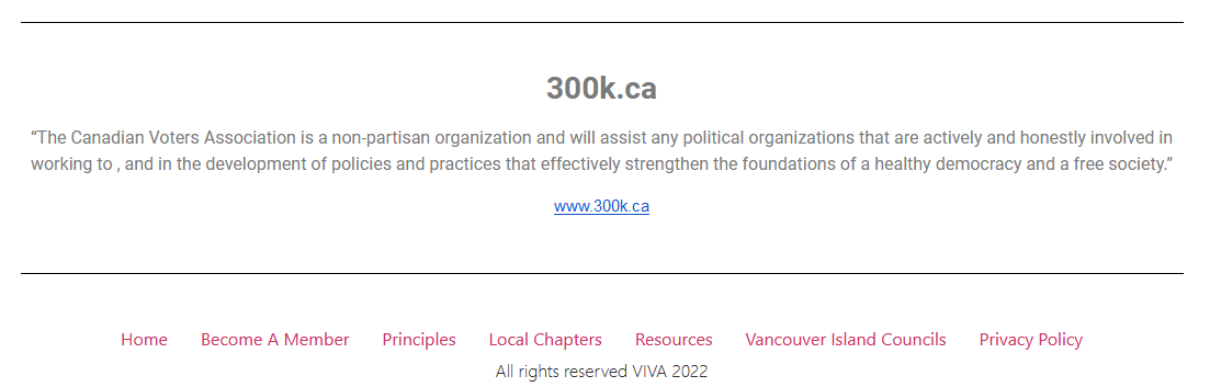 VIVA (Vancouver Island Voters Association), the non-profit organizations to which VIVA Victoria belongs, promotes 300k.ca, a project of the Canadian Voters Association, which is led by Kari Simpson also of Culture Guard.